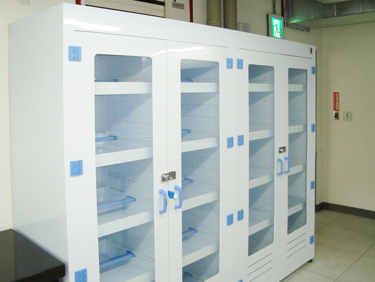 其材質採用抗強酸強鹼的 PP 板製作,內部依需求採層板式或抽屜式設計。